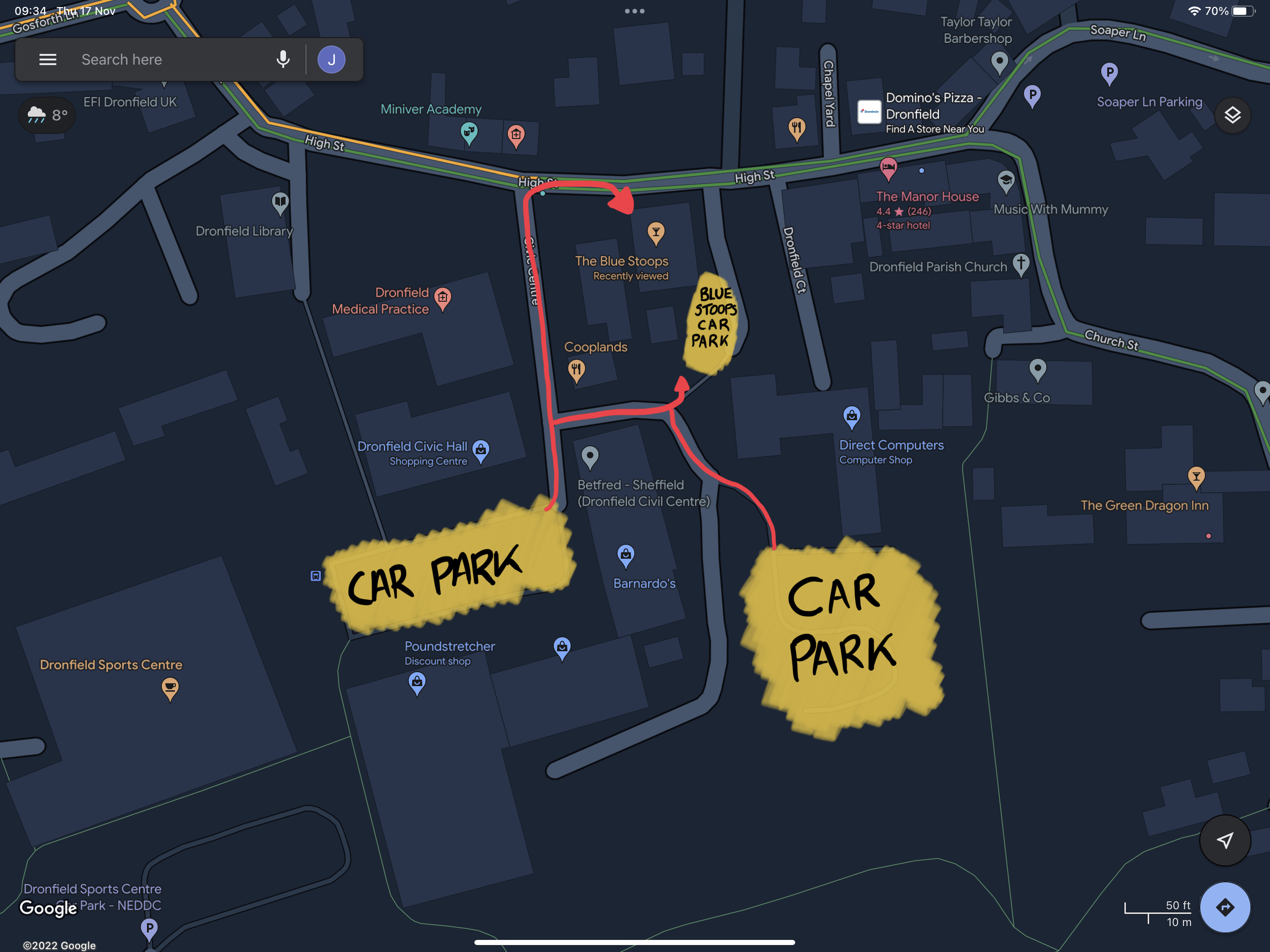 There are two alternative public car parks situated to the rear of The Blue Stoops (highlighted in yellow)